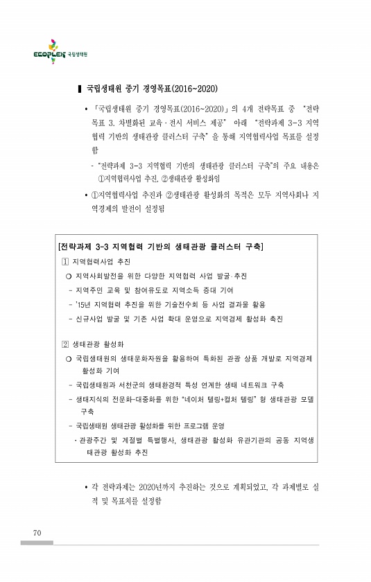 교재의 필요성 교재의 구성 교재의 활용 우리나라는 국가생물다양성전략, 자연환경보전 기본계획, 국가환경종합계획, 지속가능 발전 기본계획 등 환경정책 기본계획을 통해 생태계서비스 활용을 제시하고 있습니다. 이러한 기본계획상의 생태계서비스 정책을 실행하기 위해서는 중앙 정부뿐만 아니라 지역단위 정책을 계획하고 이행하는 공무원에 대한 교육과 홍보가 무엇보다 시급하고 중요합니다. 이 교재는 공무원의 생태계서비스 정책 이해를 증진하고 생태계서비스 정책 계획 및 이행 역량 강화를 위하여 개발하였습니다. 본 교재는 공무원 대상1박2일의 집합 교육을 가정하여 만들었습니다.2018년에 경상남도, 강릉시, 시흥시, 안산시에서 시범교육을 진행하였고, 지역사정에 따라 일부 모듈을 변용하여 4시간 단위 교육도 병행하였습니다. 본 교...