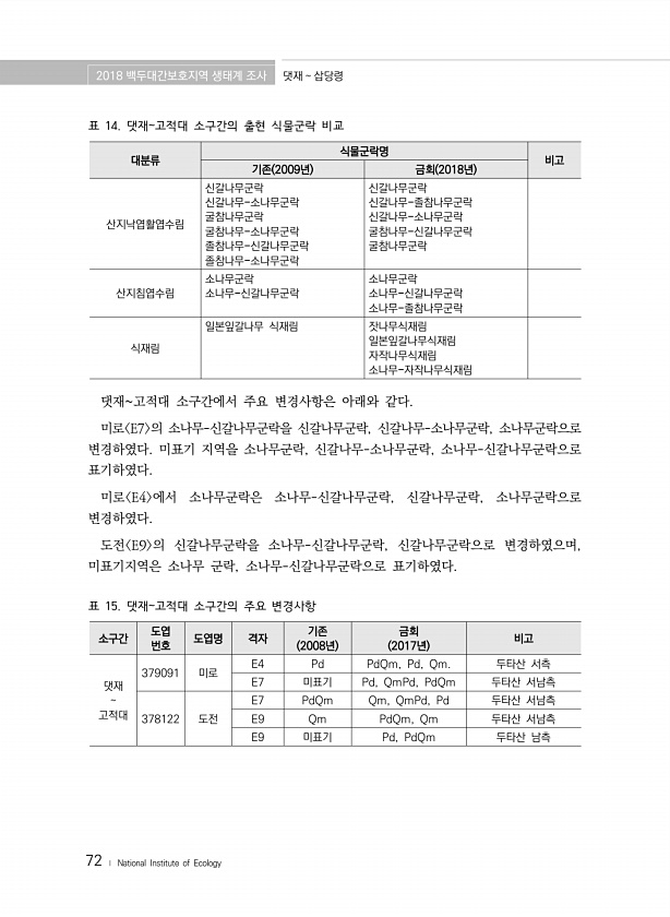 2018 백두대간보호지역 생태계 조사 댓재 삽당령 72 ? National Institute of Ecology 표 14. 댓재고적대 소구간의 출현 식물군락 비교 대분류 식물군락명 비고 기존 2009년 금회 2018년 산지낙엽활엽수림 신갈나무군락 신갈나무-소나무군락 굴참나무군락 굴참나무-소나무군락 졸참나무-신갈나무군락 졸참나무-소나무군락 신갈나무군락 신갈나무-졸참나무군락 신갈나무-소나무군락 굴참나무-신갈나무군락 굴참나무군락 산지침엽수림 소나무군락 소나무-신갈나무군락 소나무군락 소나무-신갈나무군락 소나무-졸참나무군락 식재림 일본잎갈나무 식재림 잣나무식재림 일본잎갈나무식재림 자작나무식재림 소나무-자작나무식재림 댓재고적대 소구간에서 주요 변경사항은 아래와 같다. 미로 E7 의 소나무-신갈나무군락을 신갈나무군락, ...