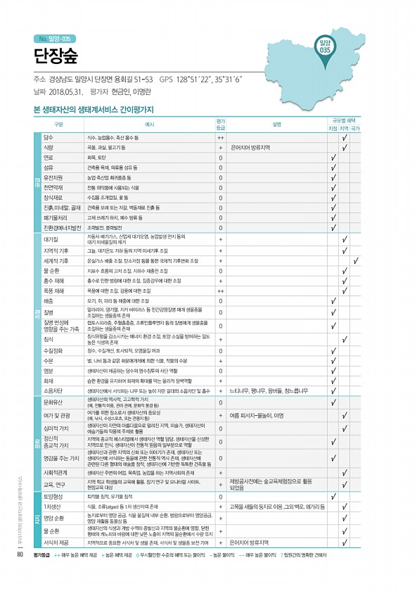 No. 밀양- 본 생태자산의 생태계서비스 간이평가지 구분 예시 평가 등급 설명 규모별 혜택 지점 지역 국가 공급 담수 식수, 농업용수, 축산 용수 등 ++ √ 식량 곡물, 과실, 물고기 등 + 은어치어 방류지역 √ 연료 화목, 토탄 0 √ 섬유 건축용 목재, 의류용 섬유 등 0 √ 유전자원 농업·축산업 희귀품종 등 0 √ 천연약재 전통 의약품에 사용되는 식물 0 √ 장식재료 수집용 조개껍질, 꽃 등 0 √ 진흙,미네랄, 골재 건축용 모래 또는 자갈, 벽돌재료 진흙 등 0 √ 폐기물처리 고체 쓰레기 하치, 폐수 방류 등 0 √ 친환경에너지발전 조력발전, 풍력발전 0 √ 조절 대기질 자동차 배기가스, 산업체 대기오염, 농업발생 먼지 등의 대기 미세물질의 제거 + √ 지역적 기후 그늘, 대기온도 저하 등의 지역 ...