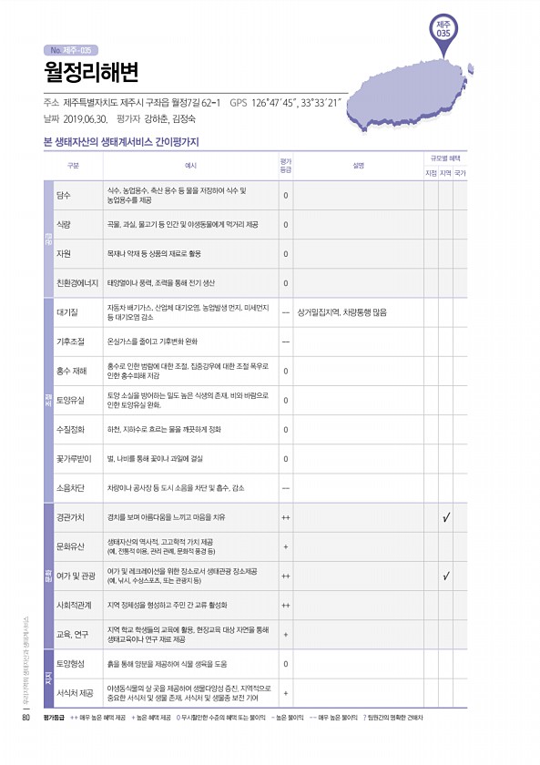No. 제주- 제주 035 본 생태자산의 생태계서비스 간이평가지 구분 예시 평가 등급 설명 규모별 혜택 지점 지역 국가 공급 담수 식수, 농업용수, 축산 용수 등 물을 저장하여 식수 및 농업용수를 제공 0 식량 곡물, 과실, 물고기 등 인간 및 야생동물에게 먹거리 제공 0 자원 목재나 약재 등 상품의 재료로 활용 0 친환경에너지 태양열이나 풍력, 조력을 통해 전기 생산 0 조절 대기질 자동차 배기가스, 산업체 대기오염, 농업발생 먼지, 미세먼지 등 대기오염 감소 -- 상거밀집지역, 차량통행 많음 기후조절 온실가스를 줄이고 기후변화 완화 -- 홍수 재해 홍수로 인한 범람에 대한 조절, 집중강우에 대한 조절 폭우로 인한 홍수피해 저감 0 토양유실 토양 소실을 방어하는 밀도 높은 식생의 존재, 비와 바람으로 인한...