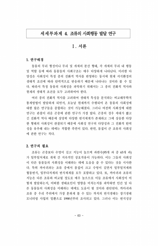 60 세세부과제 4. 조류의 사회행동 발달 연구 Ⅰ. 서론 1. 연구배경 동물의 무리 형성이나 무리 및 개체의 분산 형태, 각 개체의 무리 내 행동 및 역할 등에 따라 동물들의 사회구조는 매우 다양하게 나타난다. 이러한 다 양성은 사회성이 특정 종의 진화적 역사를 반영하는 동시에 현재 서식환경의 생태적 조건에 따라 탄력적으로 반응하기 때문에 나타나는 것이라 볼 수 있 다. 따라서 특정 동물의 사회성을 파악하기 위해서는 그 종의 진화적 역사와 현재의 생태적 조건을 모두 고려하여야 한다. 여러 종의 진화적 역사를 고려하여 생태적 특성을 분석하는 비교해부학적 통계방법이 발달하게 되면서, 오늘날 현재까지 수행되어 온 동물의 사회성에 대한 많은 연구들을 종합하는 것이 가능해졌다. 그러나 여전히 사회성에 대한 연구는 ...