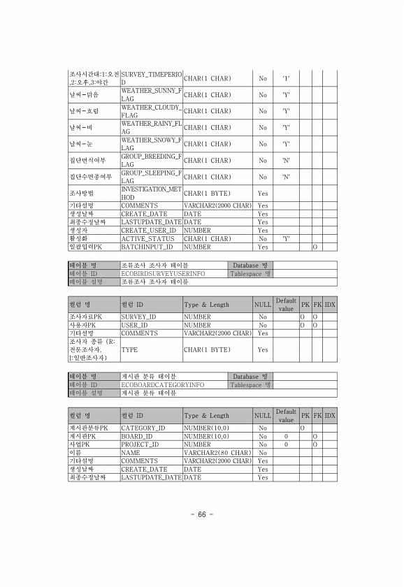 66 조사시간대1오전 ,2오후,3야간 SURVEY_TIMEPERIO D CHAR 1 CHAR No 1날씨-맑음 WEATHER_SUNNY_F LAG CHAR 1 CHAR No Y날씨-흐림 WEATHER_CLOUDY_ FLAG CHAR 1 CHAR No Y날씨-비 WEATHER_RAINY_FL AG CHAR 1 CHAR No Y날씨-눈 WEATHER_SNOWY_F LAG CHAR 1 CHAR No Y집단번식여부 GROUP_BREEDING_F LAG CHAR 1 CHAR No N집단수면종여부 GROUP_SLEEPING_F LAG CHAR 1 CHAR No N조사방법 INVESTIGATION_MET HOD CHAR 1 BYTE Yes 기타설명 COMMENTS VARCHAR2 2000 CHAR Yes 생성날짜 CRE...