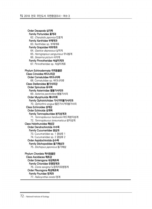 2018 전국 무인도서 자연환경조사 여수 3 72 ? National Institute of Ecology Order Decapoda 십각목 Family Portunidae 꽃게과 62. Charybdis japonica 민꽃게 Family Xanthidae 부채게과 63. Xanthidae sp. 부채게류 Family Grapsidae 바위게과 64. Gaetice depressus 납작게 65. Hemigrapsus sanguineus 무늬발게 66. Sesarma pictum 사각게 Family Pinnotheridae 속살이게과 67. Pinnotheridae sp. 속살이게류 Phylum Echinodermata 극피동물문 Class Crinoidea 바다나리강 Order Comatulidae 바다...