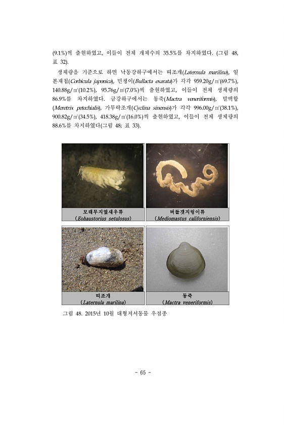 65 9.1% 씩 출현하였고, 이들이 전체 개체수의 35.5%를 차지하였다. 그림 48, 표 32 생체량을 기준으로 하면 낙동강하구에서는 띠조개 Laternula marilina , 일 본재첩 Corbicula japonica , 민챙이 Bullacta exarata 가 각각 959.20g/㎡ 69.7% , 140.88g/㎡ 10.2% , 95.76g/㎡ 7.0% 씩 출현하였고, 이들이 전체 생체량의 86.9%를 차지하였다. 금강하구에서는 동죽 Mactra veneriformis , 말백합 Meretrix petechialis , 가무락조개 Cyclina sinensis 가 각각 996.00g/㎡ 38.1% , 900.82g/㎡ 34.5% , 418.38g/㎡ 16.0% 씩 출현하였고, 이들이 전체 생체량의...