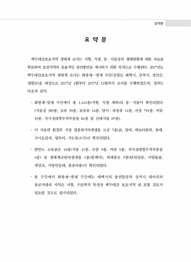 요약문 요 약 문 백두대간보호지역 생태계 조사는 지형, 식생, 동·식물상의 생태현황에 대한 자료를 확보하여 보전지역의 효율적인 관리방안을 제시하기 위한 목적으로 수행된다. 2017년도 백두대간보호지역 생태계 조사는 화방재∼댓재 구간 강원도 태백시, 삼척시, 정선군, 영월군 을 대상으로 2017년 2월부터 2017년 12월까지 조사를 수행하였으며, 결과는 다음과 같다. ? 화방재댓재 구간에서 총 1,441종 지형, 식생 제외 의 동·식물이 확인되었다 식물상 385종, 조류 50종, 포유류 14종, 양서·파충류 14종, 곤충 791종, 어류 19종, 저서성대형무척추동물 81종 및 선태식물 87종 ? 이 가운데 환경부 지정 멸종위기야생생물 Ⅱ급 7종 삵, 담비, 하늘다람쥐, 참매, 가시오갈피, 열목어, 가는돌고기...