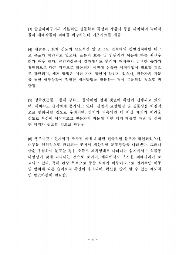 vi 3 알팔파바구미의 기본적인 생물학적 특성과 생활사 등을 파악하여 녹비작 물과 재배작물의 피해를 예방하는데 기초자료를 제공 4 갯줄풀 현재 진도의 남도석성 앞 소규모 만형태의 갯벌입지에만 대규 모 분포가 확인되고 있으나, 조류의 흐름 및 인위적인 이동에 따른 확산우 려가 매우 높다. 공간영상분석 결과에서도 면적과 패치수의 급격한 증가가 확인되므로 다른 지역으로 확산되기 이전에 신속한 제거작업이 필요할 것으 로 판단되며, 제거 방법은 여러 가지 방안이 알려져 있으나, 전문가의 자문 을 통한 현장상황에 적합한 제거방법을 활용하는 것이 효율적일 것으로 판 단됨 5 영국갯끈풀 현재 강화도 동막해변 일대 갯벌에 확산이 진행되고 있으 며, 패치수도 급격하게 증가되고 있다. 갯벌의 토양환경 및 생물상을 이질적 으로 ...