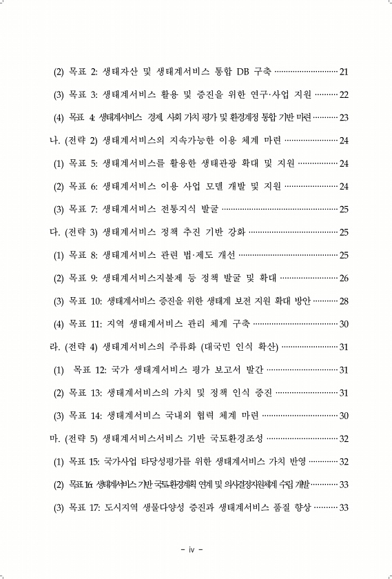 iv 2 목표 2생태자산 및 생태계서비스 통합 DB 구축 ····························21 3 목표 3생태계서비스 활용 및 증진을 위한 연구·사업 지원 ··········22 4 목표 4생태계서비스 경제. 사회 가치 평가 및 환경계정 통합 기반 마련···········23 나. 전략 2 생태계서비스의 지속가능한 이용 체계 마련 ·······················24 1 목표 5생태계서비스를 활용한 생태관광 확대 및 지원 ·················24 2 목표 6생태계서비스 이용 사업 모델 개발 및 지원 ·······················24 3 목표 7생태계서비스 전통지식 발굴 ··················································...