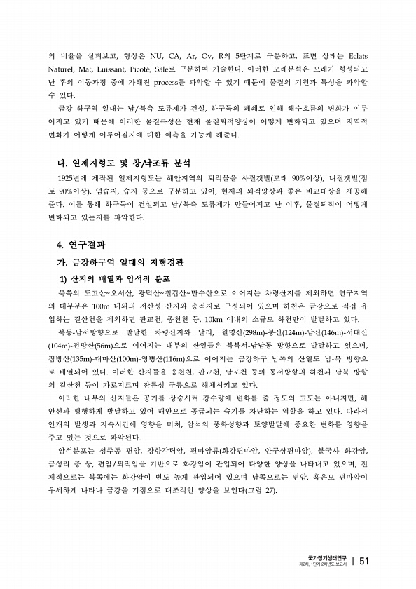 의 비율을 살펴보고 형상은 의 단계로 구분하고 표면 상태는 로 구분하여 기술한다 이러한 모래분석은 모래가 형성되고 난 후의 이동과정 중에 가해진 를 파악할 수 있기 때문에 물질의 기원과 특성을 파악할 수 있다 금강 하구역 일대는 남 북측 도류제가 건설 하구둑의 폐쇄로 인해 해수흐름의 변화가 이루 어지고 있기 때문에 이러한 물질특성은 현재 물질퇴적양상이 어떻게 변화되고 있으며 지역적 변화가 어떻게 이루어질지에 대한 예측을 가능케 해준다 다 일제지형도 및 창 낙조류 분석 년에 제작된 일제지형도는 해안지역의 퇴적물을 사질갯벌 모래 이상 니질갯벌 점 토 이상 염습지 습지 등으로 구분하고 있어 현재의 퇴적양상과 좋은 비교대상을 제공해 준다 이를 통해 하구둑이 건설되고 남 북측 도류제가 만들어지고 난 이후 물질퇴적이 ...