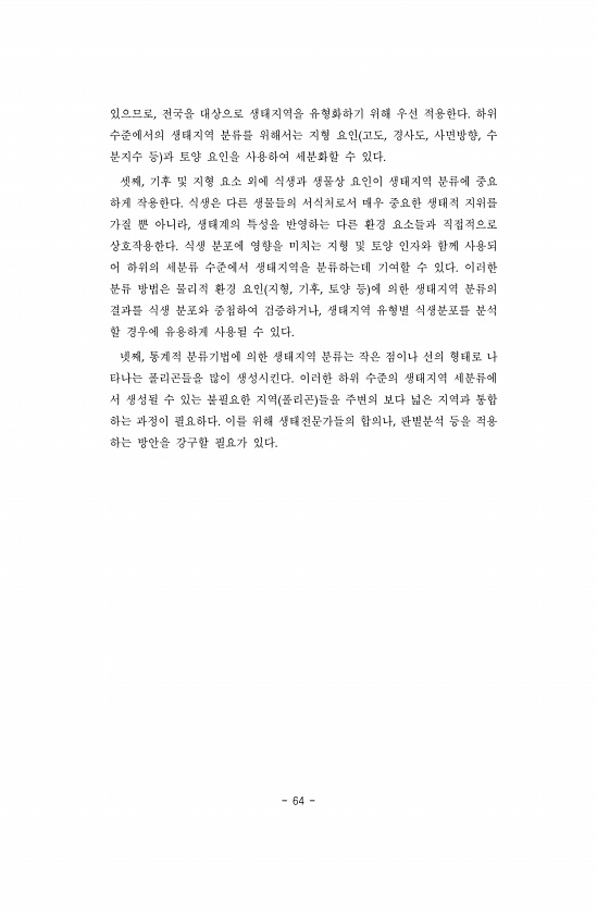 64 있으므로, 전국을 대상으로 생태지역을 유형화하기 위해 우선 적용한다. 하위 수준에서의 생태지역 분류를 위해서는 지형 요인 고도, 경사도, 사면방향, 수 분지수 등 과 토양 요인을 사용하여 세분화할 수 있다. 셋째, 기후 및 지형 요소 외에 식생과 생물상 요인이 생태지역 분류에 중요 하게 작용한다. 식생은 다른 생물들의 서식처로서 매우 중요한 생태적 지위를 가질 뿐 아니라, 생태계의 특성을 반영하는 다른 환경 요소들과 직접적으로 상호작용한다. 식생 분포에 영향을 미치는 지형 및 토양 인자와 함께 사용되 어 하위의 세분류 수준에서 생태지역을 분류하는데 기여할 수 있다. 이러한 분류 방법은 물리적 환경 요인 지형, 기후, 토양 등 에 의한 생태지역 분류의 결과를 식생 분포와 중첩하여 검증하거나, 생태지역 유...