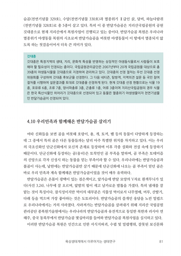 육상생태계에서 이루어지는 생태연구 81 슴곰 천연기념물 329호 , 수달 천연기념물 330호 과 멸종위기 Ⅱ급인 삵, 담비, 하늘다람쥐 천연기념물 328호 로 총 5종이 살고 있다. 특히 이 중 반달가슴곰은 지리산국립공원의 공원 깃대종으로 현재 지리산에서 복원사업이 진행되고 있는 중이다. 반달가슴곰 복원은 우리나라 멸종위기 야생동물 복원의 시초로써 반달가슴곰을 비롯한 야생동물이 이 땅에서 멸종되지 않 도록 하는 첫걸음이어서 더욱 큰 의미가 있다. 깃대종 깃대종은 특정지역의 생태, 지리, 문화적 특성을 반영하는 상징적인 야생동식물로서 사람들이 보호 해야 할 필요성이 인정되는 종이다. 국립공원관리공단은 2007년부터 20개 국립공원을 대상으로 총 39종의 야생동식물을 깃대종으로 지정하여 관리하고 있다. 깃대종의...