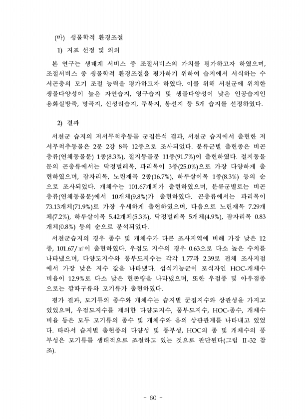 60 마 생물학적 환경조절 지표 선정 및 의의 본 연구는 생태계 서비스 중 조절서비스의 가치를 평가하고자 하였으며 조절서비스 중 생물학적 환경조절을 평가하기 위하여 습지에서 서식하는 수 서곤충의 모기 조절 능력을 평가하고자 하였다 이를 위해 서천군에 위치한 생물다양성이 높은 자연습지 영구습지 및 생물다양성이 낮은 인공습지인 용화실방죽 명곡지 신성리습지 두북지 봉선지 등 개 습지를 선정하였다 결과 서천군 습지의 저서무척추동물 군집분석 결과 서천군 습지에서 출현한 저 서무척추동물은 문 강 목 종으로 조사되었다 분류군별 출현종은 비곤 충류 연체동물문 종 절지동물문 종 이 출현하였다 절지동물 문의 곤충류에서는 딱정벌레목 파리목이 종 으로 가장 다양하게 출 현하였으며 잠자리목 노린재목 종 하루살이목 종 등의 순 으로...