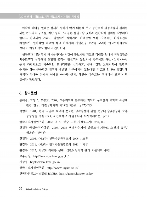 2015 생태·경관보전지역 정밀조사 거금도 적대봉 70 ? National Institute of Ecology 이밖에 적대봉 일대는 산세가 험하지 않기 때문에 주요 등산로에 관광객들의 편의를 위한 콘크리트 구조물, 계단 등의 구조물은 불필요할 것이라 판단되어 설치를 지양해야 한다고 판단되며 거금도 일원에서 행해지는 관광산업 또한 지속적인 환경보전의 차원에서, 일반적인 관광이 아닌 관광지의 자연환경 보존을 고려한 에코투어리즘의 형태로 이루어져야 한다고 판단된다. 연륙교가 개통 된지 약 4년이라는 시간이 흘렀지만 거금도 적대봉 일대의 지형경관은 외부로부터 심각하게 위협된 흔적이 관찰되지 않았기에 향후에도 해안·산지·하천 등의 다방면으로 지속적인 모니터링을 실시하고, 생태·경관 보전지역에 관광객 유치를 위한 무...