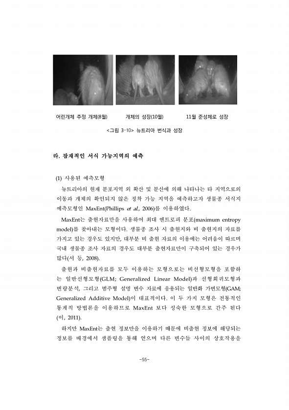 -55- 어린개체 추정 개체 8월 개체의 성장 10월 11월 준성체로 성장 그림 3-10 뉴트리아 번식과 성장 라. 잠재적인 서식 가능지역의 예측 1 사용된 예측모형 뉴트리아의 현재 분포지역 외 확산 및 분산에 의해 나타나는 타 지역으로의 이동과 개체의 확인되지 않은 정착 가능 지역을 예측하고자 생물종 서식지 예측모형인 MaxEnt Phillips et al., 2006 를 이용하였다. MaxEnt는 출현자료만을 사용하여 최대 엔트로피 분포 maximum entropy model 를 찾아내는 모형이다. 생물종 조사 시 출현지와 비 출현지의 자료를 가지고 있는 경우도 있지만, 대부분 비 출현 자료의 이용에는 어려움이 따르며 국내 생물종 조사 자료의 경우도 대부분 출현자료만이 구축되어 있는 경우가 많다 서 등,...