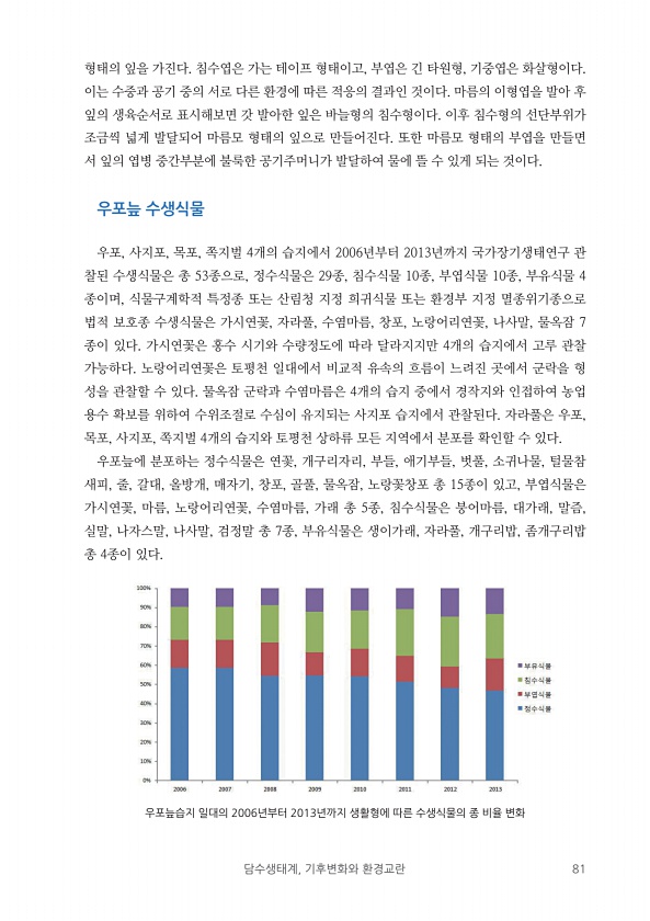 담수생태계, 기후변화와 환경교란 81 형태의 잎을 가진다. 침수엽은 가는 테이프 형태이고, 부엽은 긴 타원형, 기중엽은 화살형이다. 이는 수중과 공기 중의 서로 다른 환경에 따른 적응의 결과인 것이다. 마름의 이형엽을 발아 후 잎의 생육순서로 표시해보면 갓 발아한 잎은 바늘형의 침수형이다. 이후 침수형의 선단부위가 조금씩 넓게 발달되어 마름모 형태의 잎으로 만들어진다. 또한 마름모 형태의 부엽을 만들면 서 잎의 엽병 중간부분에 불룩한 공기주머니가 발달하여 물에 뜰 수 있게 되는 것이다. 우포늪 수생식물 우포, 사지포, 목포, 쪽지벌 4개의 습지에서 2006년부터 2013년까지 국가장기생태연구 관 찰된 수생식물은 총 53종으로, 정수식물은 29종, 침수식물 10종, 부엽식물 10종, 부유식물 4 종이며, 식물...