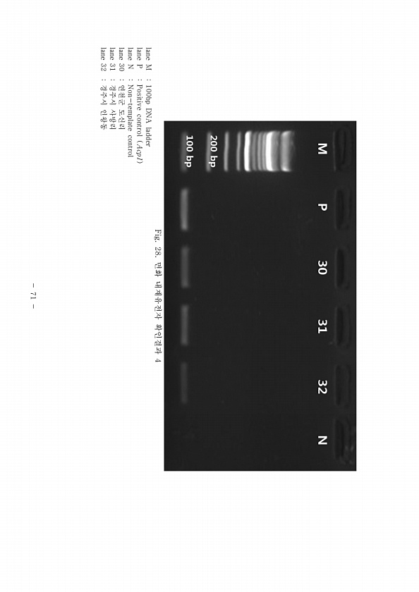 71 Fig. 28. 면화 내재유전자 확인결과 4 lane M 100bp DNA ladder lane P Positive control Acp1 lane N Non-template control lane 30 연천군 도신리 lane 31 경주시 사방리 lane 32 경주시인왕동