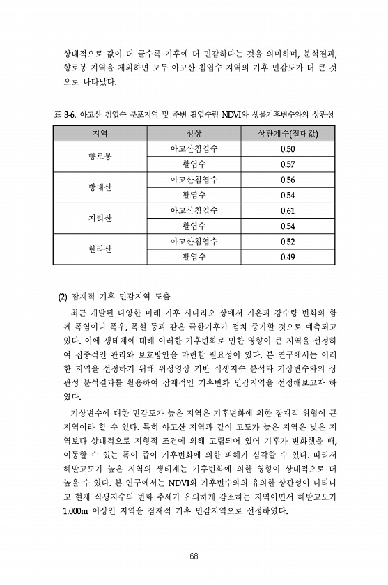 68 상대적으로 값이 더 클수록 기후에 더 민감하다는 것을 의미하며 분석결과 향로봉 지역을 제외하면 모두 아고산 침엽수 지역의 기후 민감도가 더 큰 것 으로 나타났다 지역 성상 상관계수 절대값 향로봉 아고산침엽수 활엽수 방태산 아고산침엽수 활엽수 지리산 아고산침엽수 활엽수 한라산 아고산침엽수 활엽수 표 아고산 침엽수 분포지역 및 주변 활엽수림 와 생물기후변수와의 상관성 잠재적 기후 민감지역 도출 최근 개발된 다양한 미래 기후 시나리오 상에서 기온과 강수량 변화와 함 께 폭염이나 폭우 폭설 등과 같은 극한기후가 점차 증가할 것으로 예측되고 있다 이에 생태계에 대해 이러한 기후변화로 인한 영향이 큰 지역을 선정하 여 집중적인 관리와 보호방안을 마련할 필요성이 있다 본 연구에서는 이러 한 지역을 선정하기 위해 위...