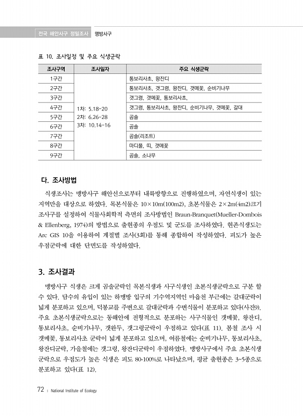 전국 해안사구 정밀조사 맹방사구 72 ? National Institute of Ecology 조사구역 조사일자 주요 식생군락 1구간 1차5.18-20 2차6.26-28 3차10.14-16 통보리사초, 왕잔디 2구간 통보리사초, 갯그령, 왕잔디, 갯메꽃, 순비기나무 3구간 갯그령, 갯메꽃, 통보리사초, 4구간 갯그령, 통보리사초, 왕잔디, 순비기나무, 갯메꽃, 갈대 5구간 곰솔 6구간 곰솔 7구간 곰솔 리조트 8구간 마디풀, 띠, 갯메꽃 9구간 곰솔, 소나무 표 10. 조사일정 및 주요 식생군락 다. 조사방법 식생조사는 맹방사구 해안선으로부터 내륙방향으로 진행하였으며, 자연식생이 있는 지역만을 대상으로 하였다. 목본식물은 10×10m 100m2 , 초본식물은 2×2m 4m2 크기 조사구를 설정하여 식물사회학...