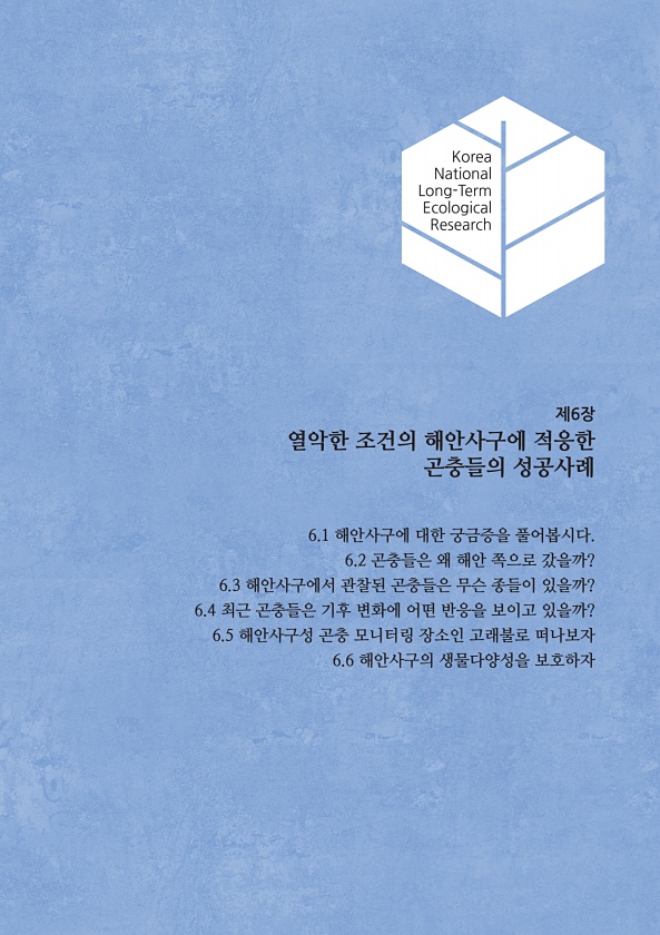 기후변화와 연안생물, 육상동물의 생존전략 81 Korea National Long-Term Ecological Research 제6장 열악한 조건의 해안사구에 적응한 곤충들의 성공사례 6.1 해안사구에 대한 궁금증을 풀어봅시다. 6.2 곤충들은 왜 해안 쪽으로 갔을까? 6.3 해안사구에서 관찰된 곤충들은 무슨 종들이 있을까? 6.4 최근 곤충들은 기후 변화에 어떤 반응을 보이고 있을까? 6.5 해안사구성 곤충 모니터링 장소인 고래불로 떠나보자 6.6 해안사구의 생물다양성을보호하자