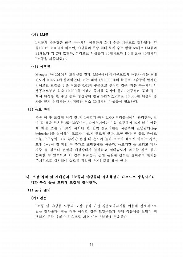 71 가 LM콩 LM콩의 파종량은 화분 수용체인 야생콩의 화기 수를 기준으로 정하였다. 김 등 2012; 2013 에 따르면, 야생콩의 주당 최대 화기 수는 평균 69개로 LM콩의 31개보다 약 2배 많았다. 그러므로 야생콩의 30개체보다 1.5배 많은 45개체의 LM콩을 파종하였다. 나 야생콩 Mizuguti 등 2010 의 포장실험 결과, LM콩에서 야생콩으로의 유전자 이동 최대 빈도가 0.097%에 불과하였다. 이는 대략 1/10,000개의 확률로 교잡종이 발생한 것이므로 교잡종 검출 강도를 0.01% 수준으로 설정할 경우, 화분 수용체인 야 생콩으로부터 최소 10,000개 이상의 종자를 얻어야 한다. 연구결과 포장 평가 에서 야생콩 한 주당 종자 생산량이 평균 343개였으므로 10,000개 이상의 종...