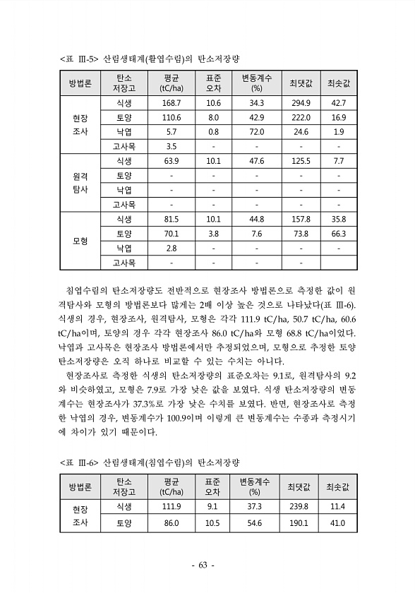 방법론 탄소 저장고 평균 tC/ha 표준 오차 변동계수 % 최댓값 최솟값 현장 조사 식생 168.7 10.6 34.3 294.9 42.7 토양 110.6 8.0 42.9 222.0 16.9 낙엽 5.7 0.8 72.0 24.6 1.9 고사목 3.5 원격 탐사 식생 63.9 10.1 47.6 125.5 7.7 토양 낙엽 고사목 모형 식생 81.5 10.1 44.8 157.8 35.8 토양 70.1 3.8 7.6 73.8 66.3 낙엽 2.8 고사목 표 산림생태계 활엽수림 의 탄소저장량 방법론 탄소 저장고 평균 tC/ha 표준 오차 변동계수 % 최댓값 최솟값 현장 조사 식생 111.9 9.1 37.3 239.8 11.4 토양 86.0 10.5 54.6 190.1 41.0 표 산림생태계 침엽수림 의 탄소저장량 침...