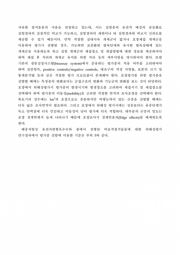 사육한 절지동물의 사용을 권장하고 있는데, 이는 실험종의 유전적 배경의 균등화로 실험결과의 실질적인 비교가 가능하고, 실험결과의 재현이나 타 실험결과와 비교시 신뢰도를 제공할 수 있기 때문이다. 만약 적절한 실내사육 개체군이 없거나 포장채집 개체군을 이용하여 평가가 진행될 경우, 가능하면 표준화된 발육단계와 유사한 발육상태에 있는 개체군을 사용하도록 하고 실험 개체군의 채집장소 및 채집방법에 대한 정보를 제공하여야 하며 채집 후 처리와 개체군 유지를 위한 처리 등의 세부사항을 명시하여야 한다. 또한 기존의 생물검정시스템 bioassay system 에서 준용하는 평가종의 적용 여부를 고려하여야 하며 검증항목, positive controls/negative controls, 대조구의 적정 사망률, 표본의 크...