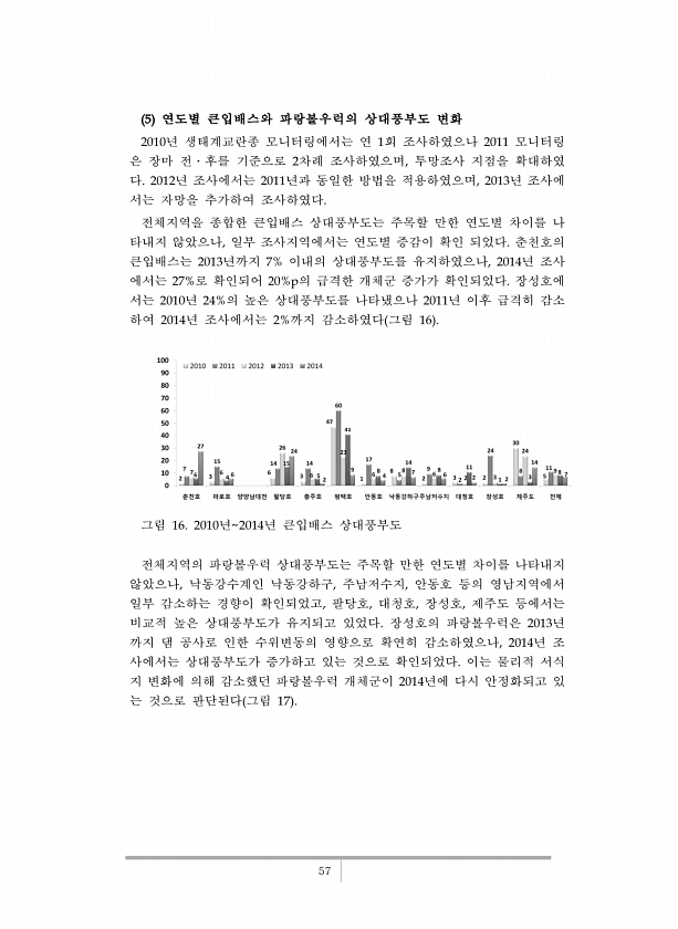 57 5 연도별 큰입배스와 파랑볼우럭의 상대풍부도 변화 2010년 생태계교란종 모니터링에서는 연 1회 조사하였으나 2011 모니터링 은 장마 전?후를 기준으로 2차례 조사하였으며, 투망조사 지점을 확대하였 다. 2012년 조사에서는 2011년과 동일한 방법을 적용하였으며, 2013년 조사에 서는 자망을 추가하여 조사하였다. 전체지역을 종합한 큰입배스 상대풍부도는 주목할 만한 연도별 차이를 나 타내지 않았으나, 일부 조사지역에서는 연도별 증감이 확인 되었다. 춘천호의 큰입배스는 2013년까지 7% 이내의 상대풍부도를 유지하였으나, 2014년 조사 에서는 27%로 확인되어 20%p의 급격한 개체군 증가가 확인되었다. 장성호에 서는 2010년 24%의 높은 상대풍부도를 나타냈으나 2011년 이후 급격히 감소 하여...