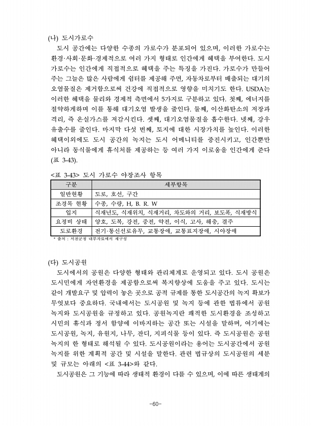 -60- 나 도시가로수 도시 공간에는 다양한 수종의 가로수가 분포되어 있으며 이러한 가로수는 환경 사회 문화 경제적으로 여러 가지 형태로 인간에게 혜택을 부여한다 도시 가로수는 인간에게 직접적으로 혜택을 주는 특징을 가진다 가로수가 만들어 주는 그늘은 많은 사람에게 쉼터를 제공해 주면 자동차로부터 배출되는 대기의 오염물질은 제거함으로써 건강에 직접적으로 영향을 미치기도 한다 는 이러한 혜택을 물리와 경제적 측면에서 가지로 구분하고 있다 첫째 에너지를 절약하게하며 이를 통해 대기오염 발생을 줄인다 둘째 이산화탄소의 저장과 격리 즉 온실가스를 저감시킨다 셋째 대기오염물질을 흡수한다 넷째 강우 유출수를 줄인다 마지막 다섯 번째 토지에 대한 시장가치를 높인다 이러한 혜택이외에도 도시 공간의 녹지는 도시 어메니티를 ...
