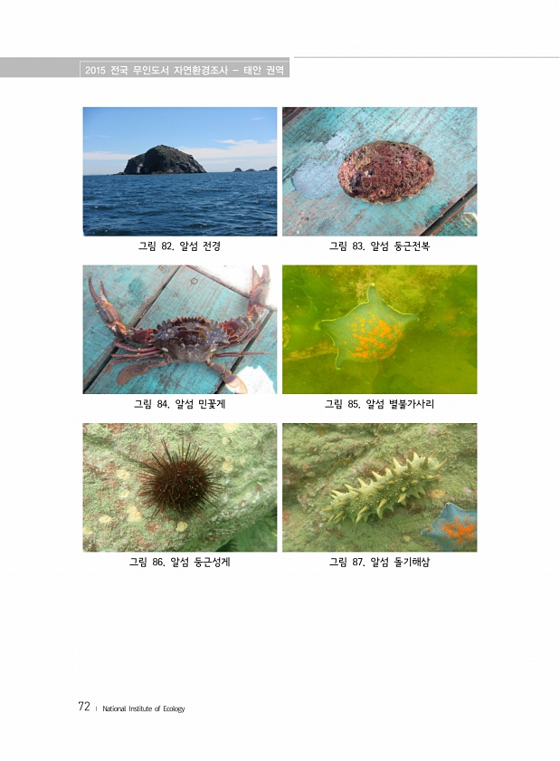 2015 전국 무인도서 자연환경조사 태안 권역 72 ? National Institute of Ecology 그림 82. 알섬 전경 그림 83. 알섬 둥근전복 그림 84. 알섬 민꽃게 그림 85. 알섬 별불가사리 그림 86. 알섬 둥근성게 그림 87. 알섬돌기해삼