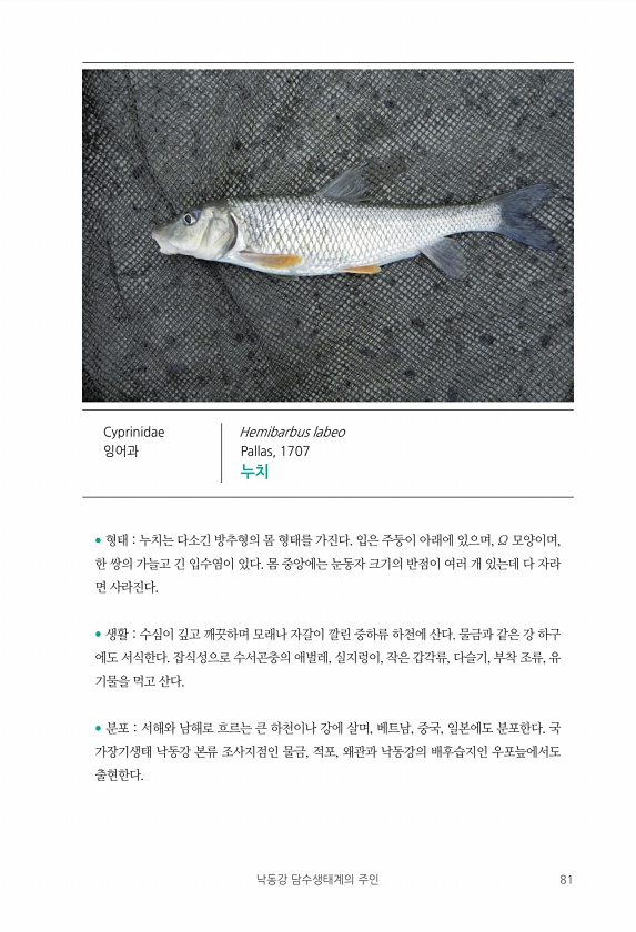 낙동강 담수생태계의 주인 81 ? 형태 누치는 다소긴 방추형의 몸 형태를 가진다. 입은 주둥이 아래에 있으며, Ω 모양이며, 한 쌍의 가늘고 긴 입수염이 있다. 몸 중앙에는 눈동자 크기의 반점이 여러 개 있는데 다 자라 면 사라진다. ? 생활 수심이 깊고 깨끗하며 모래나 자갈이 깔린 중하류 하천에 산다. 물금과 같은 강 하구 에도 서식한다. 잡식성으로 수서곤충의 애벌레, 실지렁이, 작은 갑각류, 다슬기, 부착 조류, 유 기물을 먹고 산다. ? 분포 서해와 남해로 흐르는 큰 하천이나 강에 살며, 베트남, 중국, 일본에도 분포한다. 국 가장기생태 낙동강 본류 조사지점인 물금, 적포, 왜관과 낙동강의 배후습지인 우포늪에서도 출현한다. Cyprinidae 잉어과 Hemibarbus labeo Pallas, 1707...