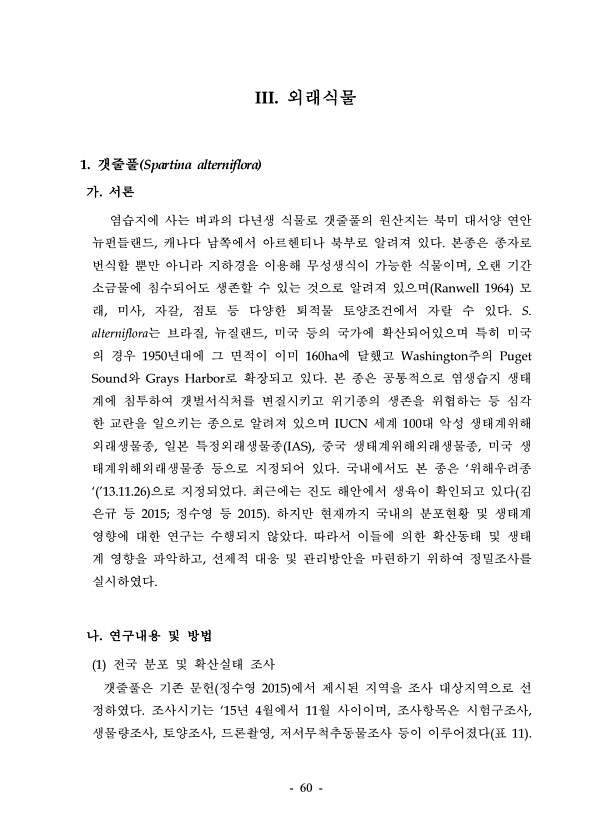 60 III. 외래식물 1. 갯줄풀 Spartina alterniflora 가. 서론 염습지에 사는 벼과의 다년생 식물로 갯줄풀의 원산지는 북미 대서양 연안 뉴펀들랜드, 캐나다 남쪽에서 아르헨티나 북부로 알려져 있다. 본종은 종자로 번식할 뿐만 아니라 지하경을 이용해 무성생식이 가능한 식물이며, 오랜 기간 소금물에 침수되어도 생존할 수 있는 것으로 알려져 있으며 Ranwell 1964 모 래, 미사, 자갈, 점토 등 다양한 퇴적물 토양조건에서 자랄 수 있다. S. alterniflora는 브라질, 뉴질랜드, 미국 등의 국가에 확산되어있으며 특히 미국 의 경우 1950년대에 그 면적이 이미 160ha에 달했고 Washington주의 Puget Sound와 Grays Harbor로 확장되고 있다. 본 종은 공통...