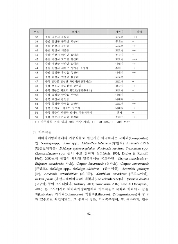 62 번호 소재지 서식지 피해 37 충남 공주시 봉황동 도로변 +++ 38 충남 금산군 군북면 외부리 휴게소 + 39 충남 논산시 강산동 도로변 ++ 40 충남 당진시 채운동 도로변 ++ 41 충남 서산시 해미면 읍내리 농경지 + 42 충남 아산시 도고면 향산리 도로변 +++ 43 충남 예산군 덕산면 음내리 나대지 ++ 44 충남 천안시 서북구 성거읍 요방리 휴게소 ++ 45 충남 홍성군 홍성읍 옥완리 나대지 ++ 46 충북 괴산군 연풍면 삼풍리 도로변 + 47 충북 단양군 단성면 하방리 단양휴게소 도로변 + 48 충북 보은군 속리산면 상판리 경작지 ++ 49 충북 영동군 회포리 황간면 황간휴게소 도로변 + 50 충북 음성군 금왕읍 무극리 나대지 + 51 충북 제천시 왕암동 나대지 + 52 충북 증평군 증평...
