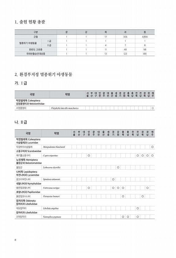 8 1. 출현 현황 총괄 구분 문 강 목 과 종 곤충 1 1 17 306 4,894 멸종위기 야생동물 Ⅰ급 1 1 1 1 1 Ⅱ급 1 1 4 7 8 한반도 고유종 1 1 11 48 98 국외반출승인대상종 1 1 13 123 481 2. 환경부지정 멸종위기 야생동물 가. Ⅰ급 국명 학명 서 울 부산 대구 인천 광주 대전 울산 세종 경기 강원 충북 충남 전북 전남 경북 경남 제주 딱정벌레목 Coleoptera 검정풍뎅이과 Melolonthidae 수염풍뎅이 Polyphylla laticollis manchurica ○ 나. Ⅱ급 국명 학명 서 울 부산 대구 인천 광주 대전 울산 세종 경기 강원 충북 충남 전북 전남 경북 경남 제주 딱정벌레목 Coleoptera 사슴벌레과 Lucanidae 두점박이사슴벌레 Met...