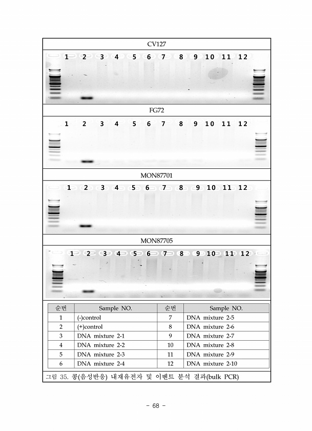 CV127 FG72 MON87701 MON87705 순번 Sample NO. 순번 Sample NO. 1 control 7 DNA mixture 2-5 2 + control 8 DNA mixture 2-6 3 DNA mixture 2-1 9 DNA mixture 2-7 4 DNA mixture 2-2 10 DNA mixture 2-8 5 DNA mixture 2-3 11 DNA mixture 2-9 6 DNA mixture 2-4 12 DNA mixture 2-10 콩 음성반응 내재유전자 및 이벤트 분석 결과 bulk PCR