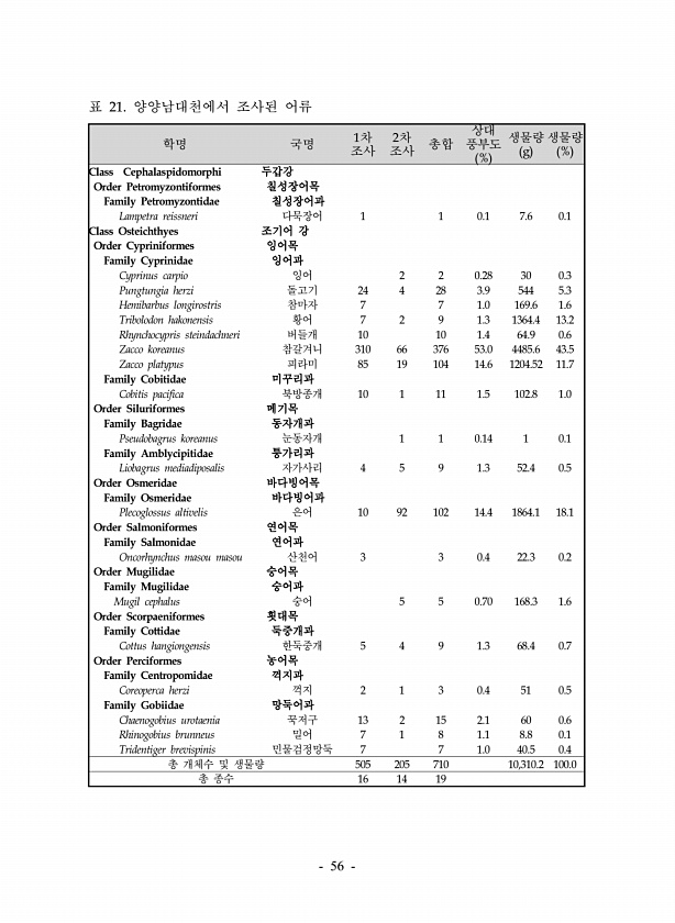 56 학명 국명 1차 조사 2차 조사 총합 상대 풍부도 % 생물량 g 생물량 % Class Cephalaspidomorphi 두갑강 Order Petromyzontiformes 칠성장어목 Family Petromyzontidae 칠성장어과 Lampetra reissneri 다묵장어 1 1 0.1 7.6 0.1 Class Osteichthyes 조기어 강 Order Cypriniformes 잉어목 Family Cyprinidae 잉어과 Cyprinus carpio 잉어 2 2 0.28 30 0.3 Pungtungia herzi 돌고기 24 4 28 3.9 544 5.3 Hemibarbus longirostris 참마자 7 7 1.0 169.6 1.6 Tribolodon hakonensis 황어 7 2 9 1....