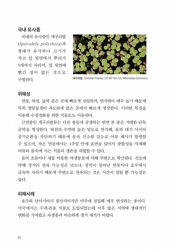 82 국내 유사종 국내의 유사종인 개구리밥 Spirodela polyrhiza 과 형태가 유사하나 크기가 작고 잎 뒷면에서 뿌리가 5개까지 자라며, 잎 뒷면에 빨간 점이 없는 것으 로 구별된다. 위해성 연못, 하천, 늪과 같은 곳에 빠르게 침입하며, 번식력이 매우 높기 때문에 특히 영양물질이 과도하게 많은 곳에서 빠르게 생장한다. 이러한 특징을 이용해 수질정화를 위한 식물로도 이용된다. 근연종인 개구리밥류는 다른 종들과 공생하는 반면 본 종은 거대한 단독 군락을 형성한다. 하천의 수면에 높은 밀도로 번식해, 물과 대기 사이의 공기순환을 차단하기 때문에 물속 산소량 감소로 어류 폐사가 발생할 수 있으며, 작은 연못에서는 1주일 안에 표면을 덮어서 광합성을 억제해 어류와 물속에 사는 식물의 생존을 위협할 수 있...