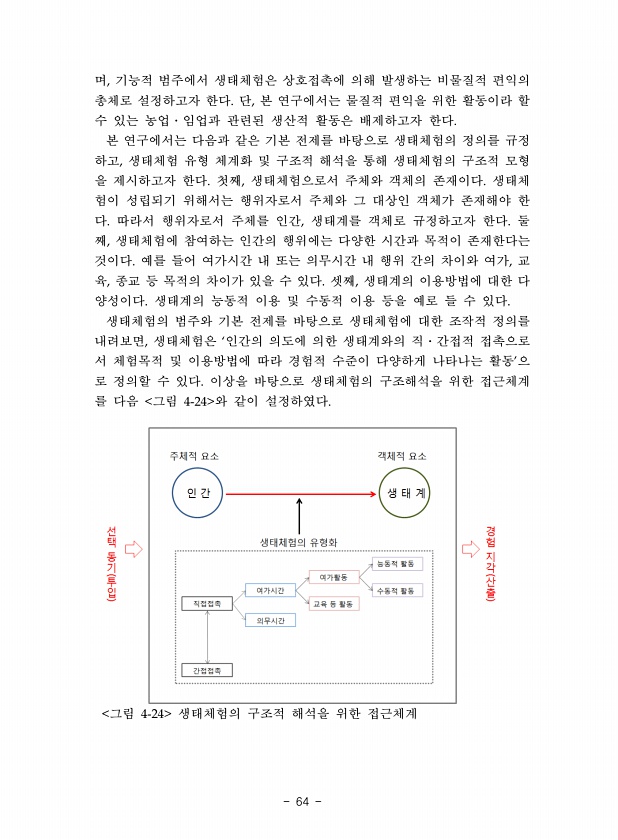 64 며 기능적 범주에서 생태체험은 상호접촉에 의해 발생하는 비물질적 편익의 총체로 설정하고자 한다 단 본 연구에서는 물질적 편익을 위한 활동이라 할 수 있는 농업 임업과 관련된 생산적 활동은 배제하고자 한다 본 연구에서는 다음과 같은 기본 전제를 바탕으로 생태체험의 정의를 규정 하고 생태체험 유형 체계화 및 구조적 해석을 통해 생태체험의 구조적 모형 을 제시하고자 한다 첫째 생태체험으로서 주체와 객체의 존재이다 생태체 험이 성립되기 위해서는 행위자로서 주체와 그 대상인 객체가 존재해야 한 다 따라서 행위자로서 주체를 인간 생태계를 객체로 규정하고자 한다 둘 째 생태체험에 참여하는 인간의 행위에는 다양한 시간과 목적이 존재한다는 것이다 예를 들어 여가시간 내 또는 의무시간 내 행위 간의 차이와 여가 교 육 ...