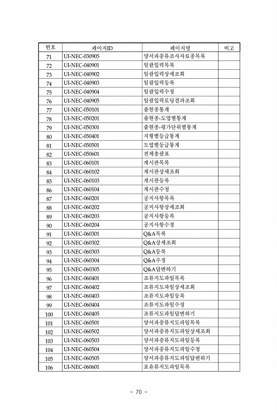70 번호 페이지ID 페이지명 비고 71 UI-NEC-030905 양서파충류조사자료종목록 72 UI-NEC-040901 일괄입력목록 73 UI-NEC-040902 일괄입력상세조회 74 UI-NEC-040903 일괄입력등록 75 UI-NEC-040904 일괄입력수정 76 UI-NEC-040905 일괄입력로딩결과조회 77 UI-NEC-050101 출현종통계 78 UI-NEC-050201 출현종-도엽별통계 79 UI-NEC-050301 출현종-평가단위별통계 80 UI-NEC-050401 지형별등급통계 81 UI-NEC-050501 도엽별등급통계 82 UI-NEC-050601 전체총괄표 83 UI-NEC-060101 게시판목록 84 UI-NEC-060102 게시판상세조회 85 UI-NEC-060103 게시판등록 8...