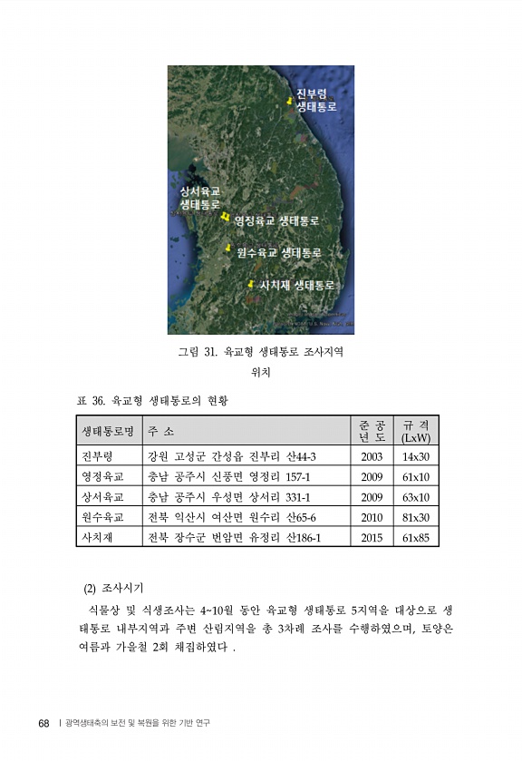 68 그림 31. 육교형 생태통로 조사지역 위치 생태통로명 주 소 준 공 년 도 규 격 진부령 강원 고성군 간성읍 진부리 산 영정육교 충남 공주시 신풍면 영정리 상서육교 충남 공주시 우성면 상서리 원수육교 전북 익산시 여산면 원수리 산 사치재 전북 장수군 번암면 유정리 산 표 36. 육교형 생태통로의 현황 조사시기 식물상 및 식생조사는 월 동안 육교형 생태통로 지역을 대상으로 생 태통로 내부지역과 주변 산림지역을 총 차례 조사를 수행하였으며 토양은 여름과 가을철 회 채집하였다 68 | 광역생태축의 보전 및 복원을 위한 기반연구
