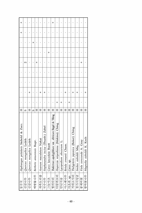 등수국 Hydrangea petiolaris Siebold & Zucc. H · · · · · · · + + 신갈나무 Quercus mongolica Ledeb. S · · · · 2 · · · · 신갈나무 Quercus mongolica Ledeb. H · + · · · · · · · 매발톱나무 Berberis amurensis Rupr. S · · · · · · + · · H · · · · + · · · · 개족도리풀 Asarum maculatum Nakai H · + · · · · · · · 국수나무 Stephanandra incisa Thunb. Zabel H · + · · · · · · · 그늘사초 Carex lanceolata Boott H · · · · · + · · · 꿩의다리 Thalictr...