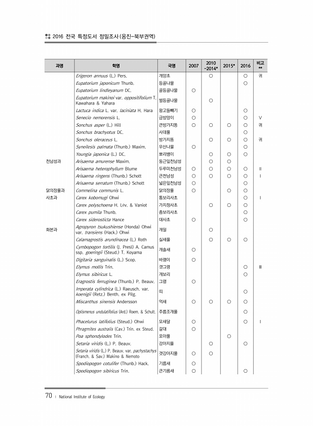 2016 전국 특정도서 정밀조사 옹진-북부권역 70 ? National Institute of Ecology 과명 학명 국명 2007 2010 -2014* 2015* 2016 비고 ** Erigeron annuus L. Pers. 개망초 ○ ○ 귀 Eupatorium japonicum Thunb. 등골나물 ○ Eupatorium lindleyanum DC. 골등골나물 ○ Eupatorium makinoi var. oppositifolium T. Kawahara & Yahara 벌등골나물 ○ Lactuca indica L. var. laciniata H. Hara 왕고들빼기 ○ ○ Senecio nemorensis L. 금방망이 ○ ○ Ⅴ Sonchus asper L. Hill 큰방가지똥 ○ ○ ○ ○ 귀 S...