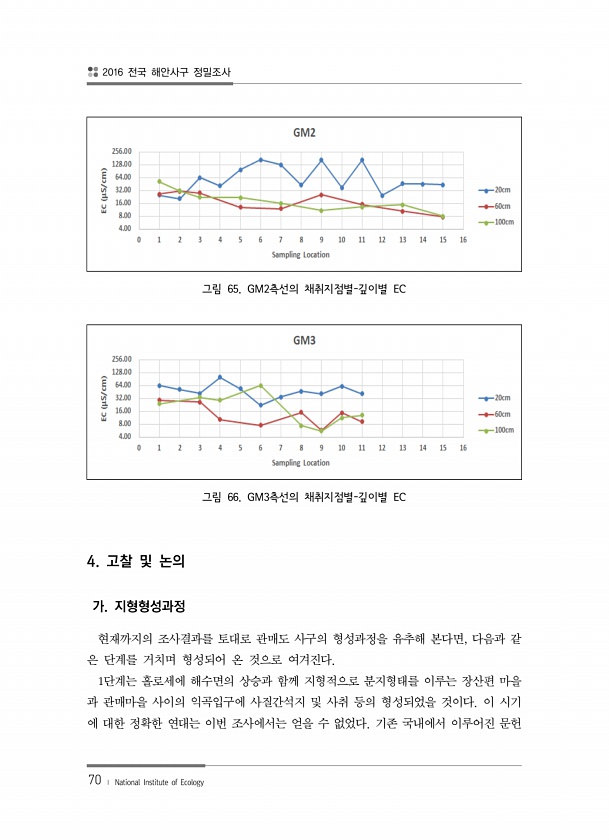 2016 전국 해안사구 정밀조사 70 ? National Institute of Ecology 그림 65. GM2측선의 채취지점별-깊이별 EC 그림 66. GM3측선의 채취지점별-깊이별 EC 4. 고찰 및 논의 가. 지형형성과정 현재까지의 조사결과를 토대로 관매도 사구의 형성과정을 유추해 본다면, 다음과 같 은 단계를 거치며 형성되어 온 것으로 여겨진다. 1단계는 홀로세에 해수면의 상승과 함께 지형적으로 분지형태를 이루는 장산편 마을 과 관매마을 사이의 익곡입구에 사질간석지 및 사취 등의 형성되었을 것이다. 이 시기 에 대한 정확한 연대는 이번 조사에서는 얻을 수 없었다. 기존 국내에서 이루어진문헌