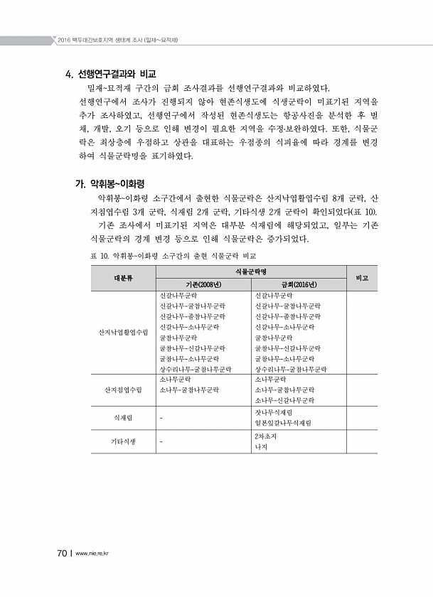 2016 백두대간보호지역 생태계 조사 밀재묘적재 70Ⅰwww.nie.re.kr 4. 선행연구결과와 비교 밀재묘적재 구간의 금회 조사결과를 선행연구결과와 비교하였다. 선행연구에서 조사가 진행되지 않아 현존식생도에 식생군락이 미표기된 지역을 추가 조사하였고, 선행연구에서 작성된 현존식생도는 항공사진을 분석한 후 벌 채, 개발, 오기 등으로 인해 변경이 필요한 지역을 수정?보완하였다. 또한, 식물군 락은 최상층에 우점하고 상관을 대표하는 우점종의 식피율에 따라 경계를 변경 하여 식물군락명을 표기하였다. 가. 악휘봉이화령 악휘봉이화령 소구간에서 출현한 식물군락은 산지낙엽활엽수림 8개 군락, 산 지침엽수림 3개 군락, 식재림 2개 군락, 기타식생 2개 군락이 확인되었다 표 10 기존 조사에서 미표기된 지역은 대부분 ...