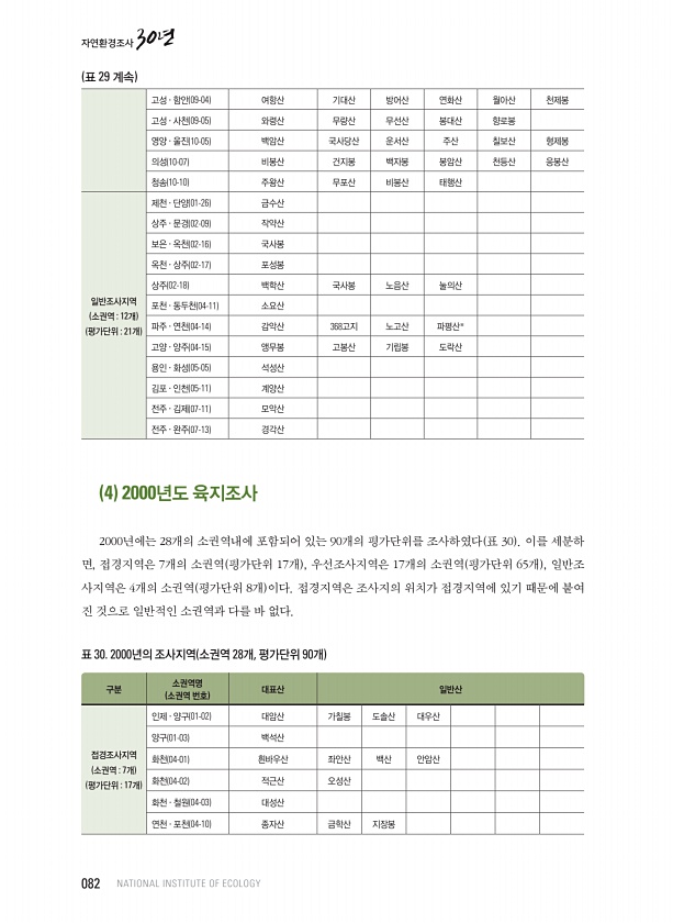 고성 · 함안 09-04 여항산 기대산 방어산 연화산 월아산 천제봉 고성 · 사천 09-05 와령산 무량산 무선산 봉대산 향로봉 영양 · 울진 10-05 백암산 국사당산 운서산 주산 칠보산 형제봉 의성 10-07 비봉산 건지봉 백자봉 봉암산 천등산 응봉산 청송 10-10 주왕산 무포산 비봉산 태행산 일반조사지역 소권역 12개 평가단위 21개 제천 · 단양 01-26 금수산 상주 · 문경 02-09 작약산 보은 · 옥천 02-16 국사봉 옥천 · 상주 02-17 포성봉 상주 02-18 백학산 국사봉 노음산 눌의산 포천 · 동두천 04-11 소요산 파주 · 연천 04-14 감악산 368고지 노고산 파평산※ 고양 · 양주 04-15 앵무봉 고봉산 기립봉 도락산 용인 · 화성 05-05 석성산 김포 · 인천 05-...