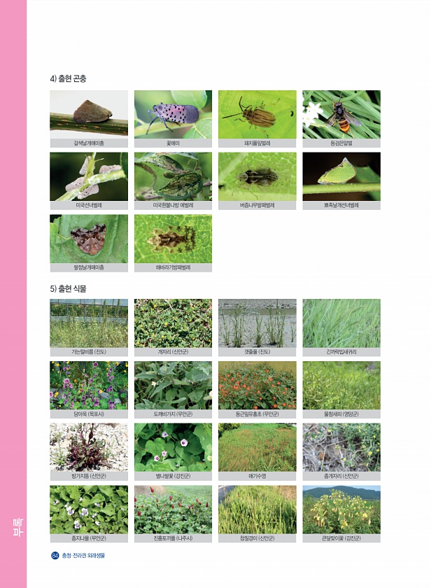 부록 84 충청?전라권 외래생물 갈색날개매미충 가는털비름 진도 방가지똥 신안군 팔점날개매미충 미국선녀벌레 당아욱 목포시 종지나물 무안군 꽃매미 개자리 신안군 별나팔꽃 강진군 해바라기방패벌레 미국흰불나방 애벌레 도깨비가지 무안군 진홍토끼풀 나주시 돼지풀잎벌레 갯줄풀 진도 애기수영 버즘나무발패벌레 둥근잎유홍초 무안군 창질경이 신안군 등검은말벌 긴까락빕새귀리 좀개자리 신안군 뾰족날개선녀벌레 물참새피 영암군 큰달맞이꽃 강진군 4 출현 곤충 5 출현식물