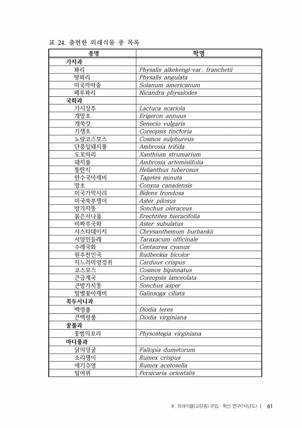 종명 학명 가지과 꽈리 Physalis alkekengi var. franchetii 땅꽈리 Physalis angulata 미국까마중 Solanum americanum 페루꽈리 Nicandra physalodes 국화과 가시상추 Lactuca scariola 개망초 Erigeron annuus 개쑥갓 Senecio vulgaris 기생초 Coreopsis tinctoria 노랑코스모스 Cosmos sulphureus 단풍잎돼지풀 Ambrosia trifida 도꼬마리 Xanthium strumarium 돼지풀 Ambrosia artemisiifolia 뚱딴지 Helianthus tuberosus 만수국아재비 Tagetes minuta 망초 Conyza canadensis 미국가막사리 Bidens frond...