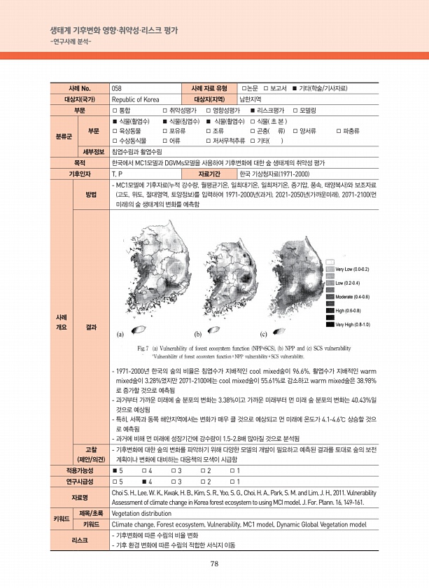78 생태계 기후변화 영향·취약성·리스크 평가 -연구사례 분석- 사례 No. 058 사례 자료 유형 □논문 □ 보고서 ■ 기타 학술/기사자료 대상지 국가 Republic of Korea 대상지 지역 남한지역 부문 □ 통합 □ 취약성평가 □ 영향성평가 ■ 리스크평가 □ 모델링 분류군 부문 ■ 식물 활엽수 ■ 식물 침엽수 ■ 식물 활엽수 □ 식물 초 본 □ 육상동물 □ 포유류 □ 조류 □ 곤충 류 □ 양서류 □ 파충류 □ 수상동식물 □ 어류 □ 저서무척추류 □ 기타 세부정보 침엽수림과 활엽수림 목적 한국에서 MC1모델과 DGVMs모델을 사용하여 기후변화에 대한 숲 생태계의 취약성 평가 기후인자 T, P 자료기간 한국 기상청자료 1971-2000 사례 개요 방법 MC1모델에 기후자료 누적 강수량, 월평균기온, 일...