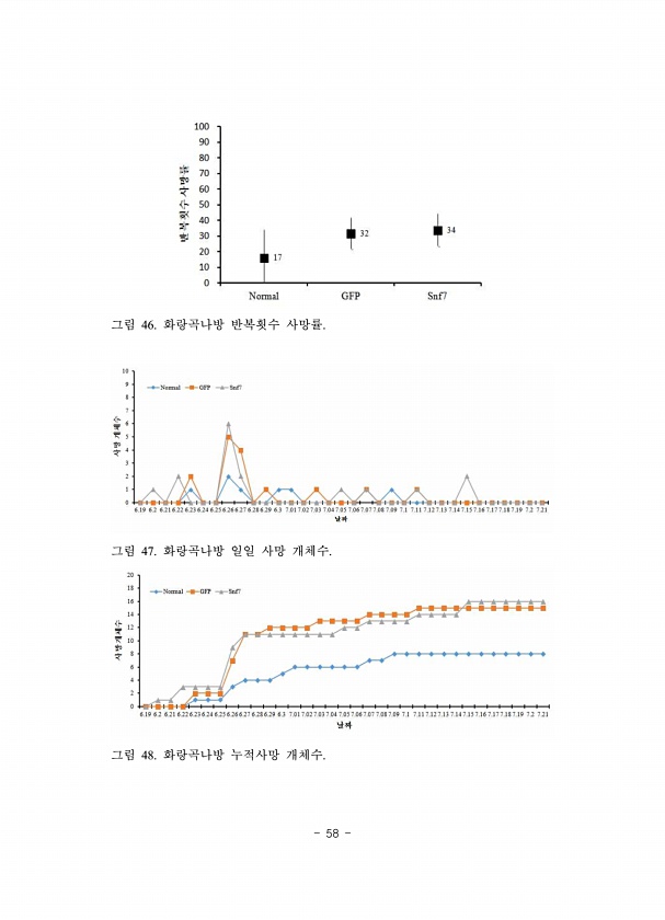 58 그림 46. 화랑곡나방 반복횟수 사망률. 그림 47. 화랑곡나방 일일 사망 개체수. 그림 48. 화랑곡나방 누적사망개체수.