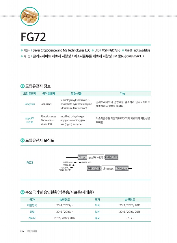 82 국립생태원 ● 개발사ⅠBayer CropScience and MS Technologies LLC ● UIDⅠMST-FGØ72-3 ● 제품명Ⅰnot available ● 특 성Ⅰ글리포세이트 제초제 저항성 이소자플루톨 제초제 저항성 LM 콩 Glycine max L. FG72 주요국가별 승인현황 식품용/사료용/재배용 국가 승인연도 국가 승인연도 대한민국 2014 2013 미국 2012 2012 2013 유럽 2016 2016 일본 2016 2016 2016 캐나다 2012 2012 2012 중국 도입유전자 정보 도입유전자 공여생물체 발현산물 기능 2mepsps Zea mays 5-enolpyruvyl shikimate-3- phosphate synthase enzyme double mutant versio...