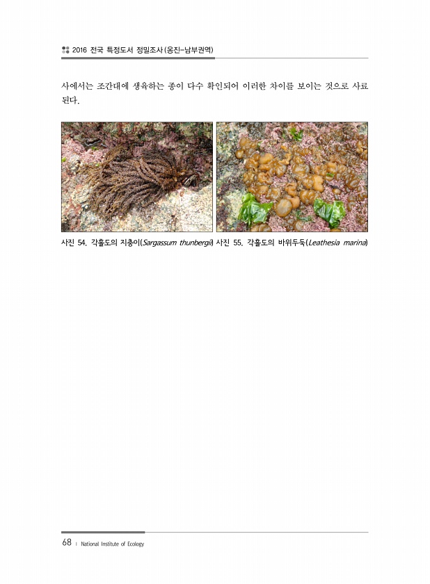 2016 전국 특정도서 정밀조사 옹진-남부권역 68 ? National Institute of Ecology 사에서는 조간대에 생육하는 종이 다수 확인되어 이러한 차이를 보이는 것으로 사료 된다. 사진 54. 각흘도의 지충이 Sargassum thunbergii 사진 55. 각흘도의 바위두둑 Leathesia marina