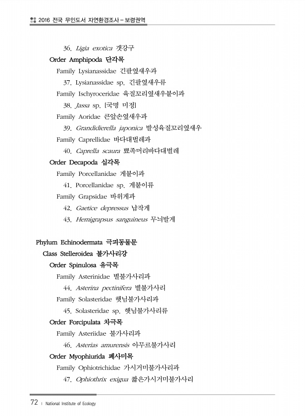 2016 전국 무인도서 자연환경조사 보령권역 72 ? National Institute of Ecology 36. Ligia exotica 갯강구 Order Amphipoda 단각목 Family Lysianassidae 긴팔옆새우과 37. Lysianassidae sp. 긴팔옆새우류 Family Ischyroceridae 육질꼬리옆새우붙이과 38. Jassa sp. [국명 미정] Family Aoridae 큰앞손옆새우과 39. Grandidierella japonica 발성육질꼬리옆새우 Family Caprellidae 바다대벌레과 40. Caprella scaura 뾰족머리바다대벌레 Order Decapoda 십각목 Family Porcellanidae 게붙이과 41. Porcellanidae sp. 게붙...